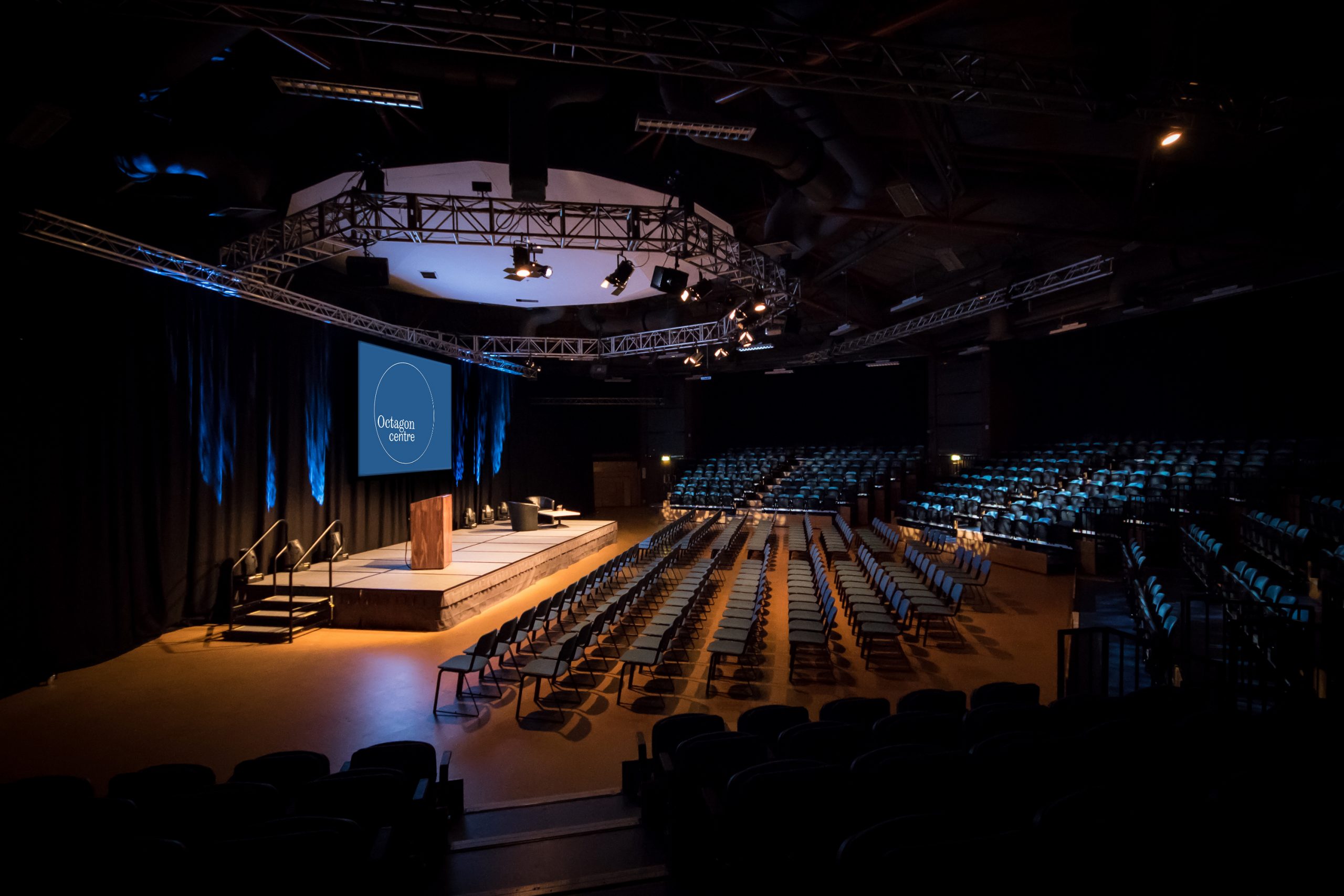With a seated capacity of up to 1230 (1500 for standing events) or 870 sqm of clear floor area, the Octagon is enormously flexible and can accommodate a wide range of events with a number of configuration options to suit every need. Conferences and exhibitions, large-scale live music gigs, sport and comedy shows are only a fraction of the wide variety of productions hosted here. There are also suites of ancillary rooms all under the same roof, available for breakout and meetings, with capacities ranging from 30 to 80 people. Modular staging systems, comprehensive technical infrastructure and first class support from our in house event and production teams complete the picture.